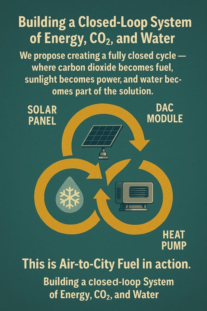 Building a Closed-Loop System of Energy, CO₂, and WaterWe propose creating a fully closed cycle —where carbon dioxide becomes fuel,sunlight becomes power,and water becomes part of the solution.This is Air-to-City Fuel in action.