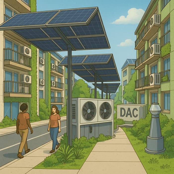 - Енергоефективні будинки опалюються системами з тепловими насосами типу «повітря–вода», що живляться сонячною електрикою або генераторами на паливі з CO₂.