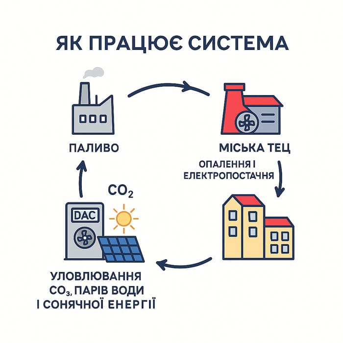 - Захоплений CO₂ ожижжується, а тепло цього процесу використовується для гарячого водопостачання.